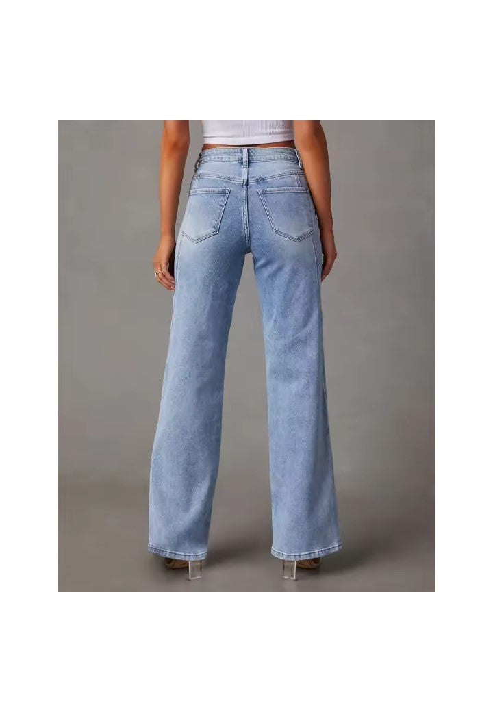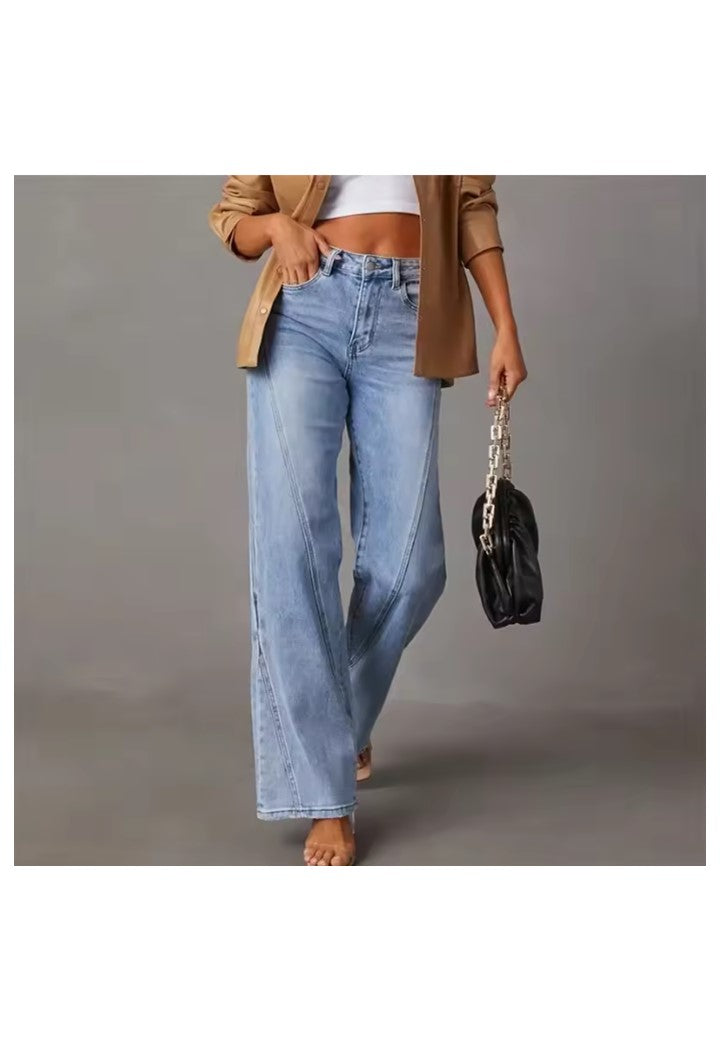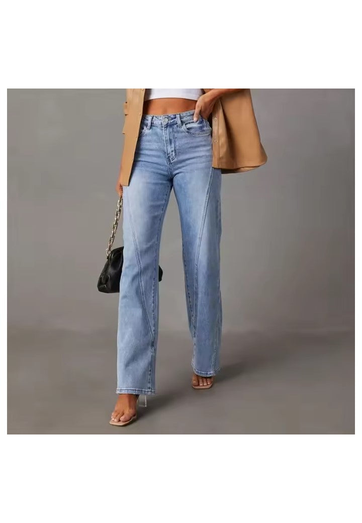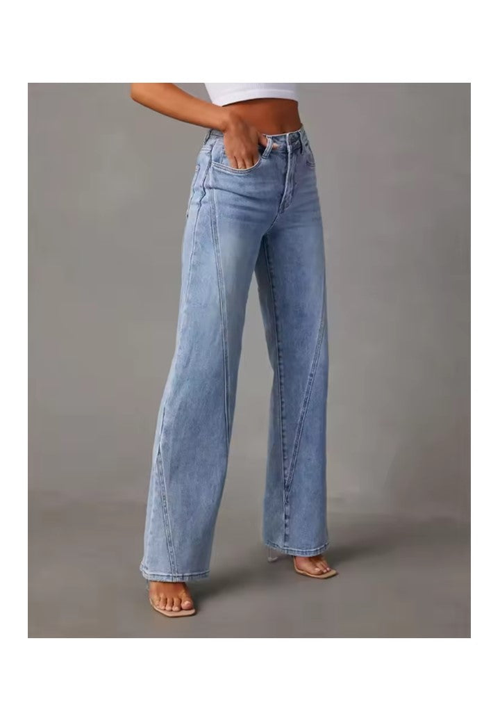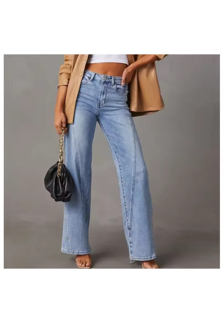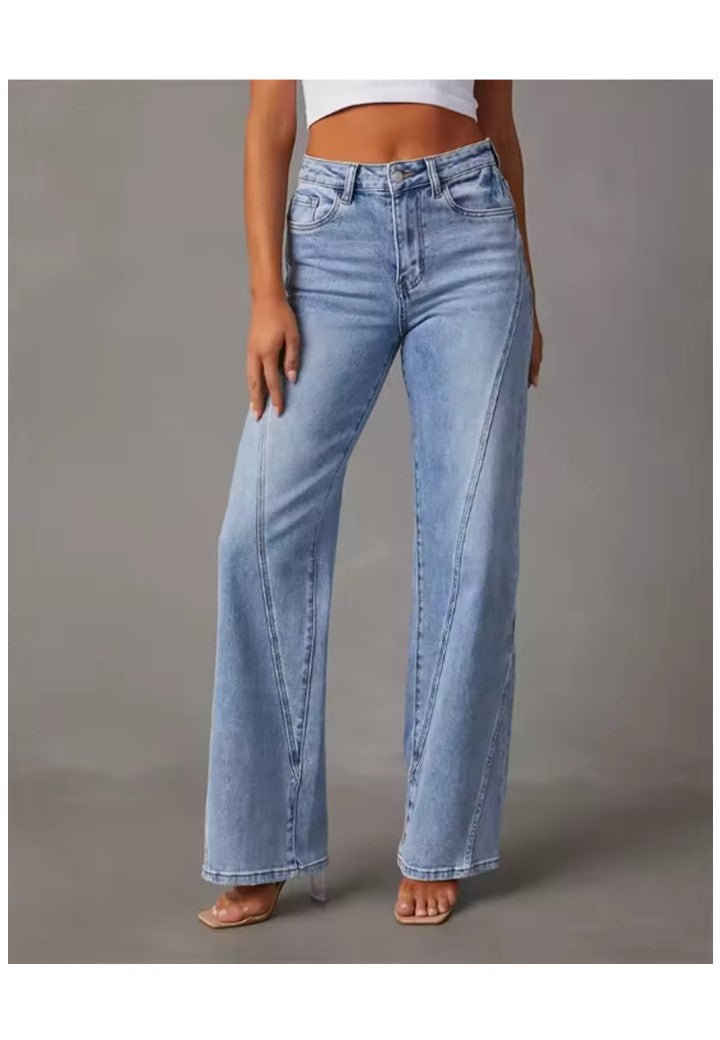 Stylowe jeansy z wysokim stanem, wykonane z elastycznego, miękkiego denimu, który doskonale dopasowuje się do sylwetki. Szerokie nogawki optycznie wydłużają nogi, a przeszycia z przodu dodają nowoczesnego charakteru. Idealne do codziennych stylizacji – zarówno z eleganckimi butami, jak i sportowymi sneakersami.