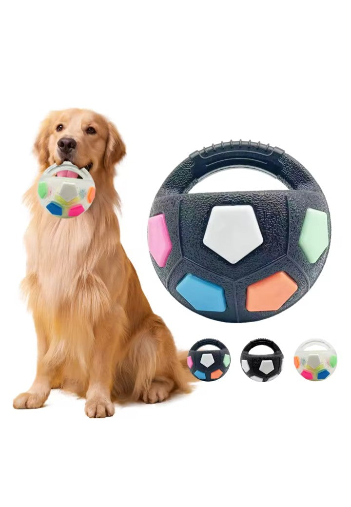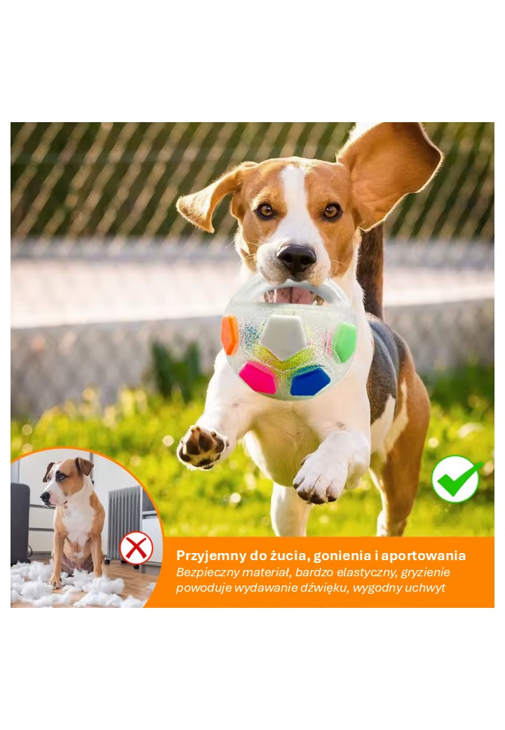 Piłka jest wykonana z trwałego, odpornego na gryzienie materiału i ma solidny uchwyt, dzięki któremu można ją łatwo rzucać, ciągnąć lub bawić się nią razem. Kolorowe powierzchnie pobudzają instynkt zabawowy Twojego psa, a efekty świetlne zapewniają dodatkową zabawę – nawet w ciemności!